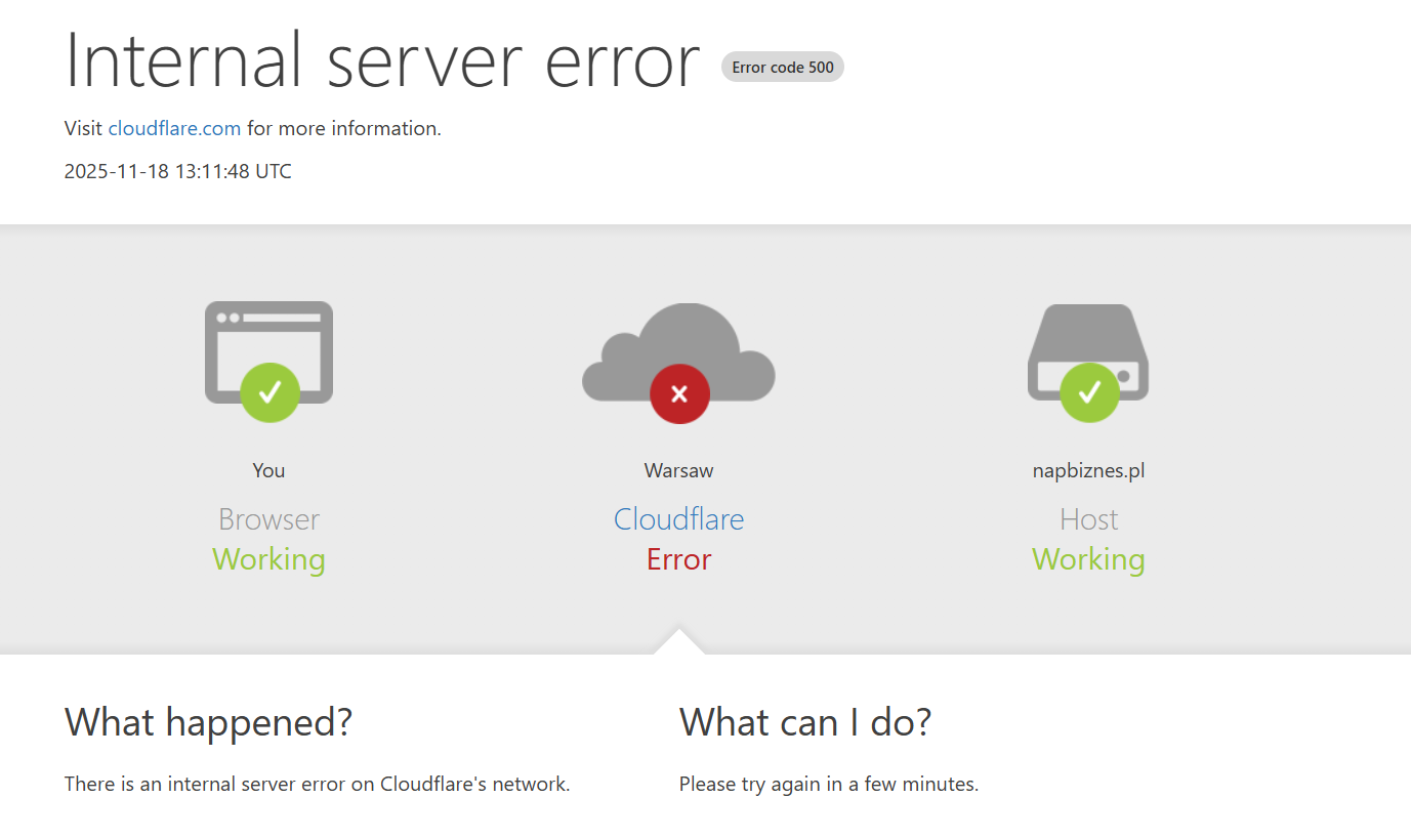 Użytkownicy zgłaszają, że strony działają przez kilka minut, po czym pojawiają się błędy 500 lub komunikaty o niedostępności serwera. Cloudflare potwierdziło problem na swojej stronie statusowej, wskazując na globalne zakłócenia w sieci i awarie dashboardu oraz API. Firma zapewnia, że pracuje nad pełnym przywróceniem usług.