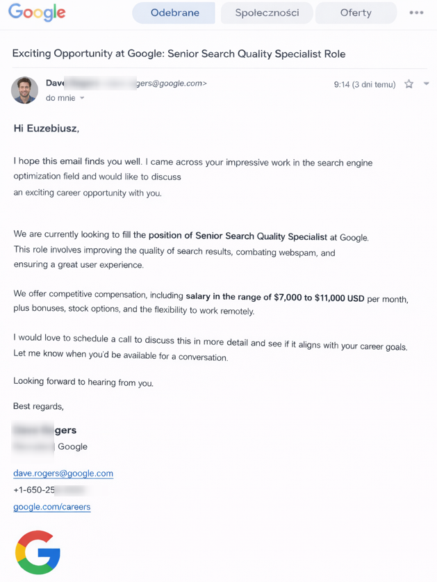 Kilka dni temu odezwał się do mnie rekruter z Google: